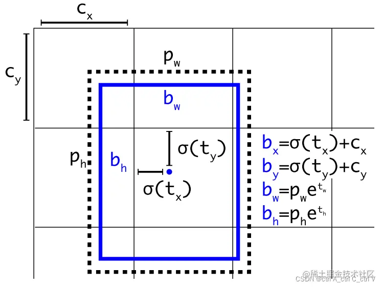 公式中的 () 表示 sigmoid函数,将网络预测结果(tx,ty,tw,th)输入到sigmoid函数中,使输出结果介于0到1之间。这样模型最终得到的检测框的中心点一定在对应的网格中,不会偏的太远。