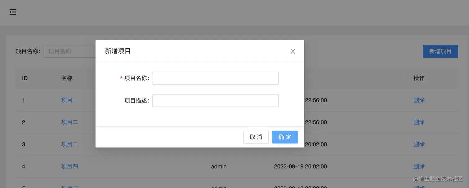 先大概分析下,页面上首先需要一个【新增】按钮,点击【新增】按钮后需要打开一个弹窗,用来填写项目信息,弹窗需要又个【确认】按钮,点击【确认】按钮后调项目创建接口,新增成功后关闭弹窗,刷新列表。