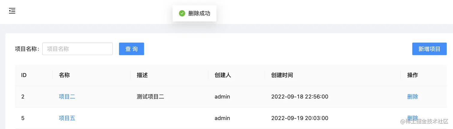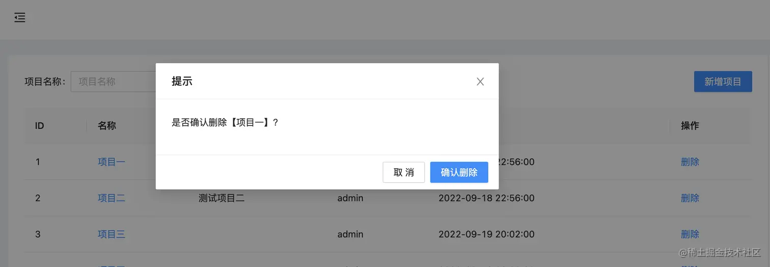 同样也是先梳理下逻辑,列表上每行都有【删除】按钮,点击【删除】按钮后弹出「是否确认删除」弹窗,点击弹窗【确认】按钮后调用删除接口,并将所在行的项目ID作为入参,删除成功后刷新列表。