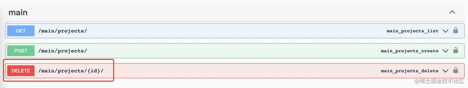 重启后,查看swagger页面接口列表,可以看到新增了一个DELETE类型的接口,这个就是删除接口,根据ID删除指定的项目。