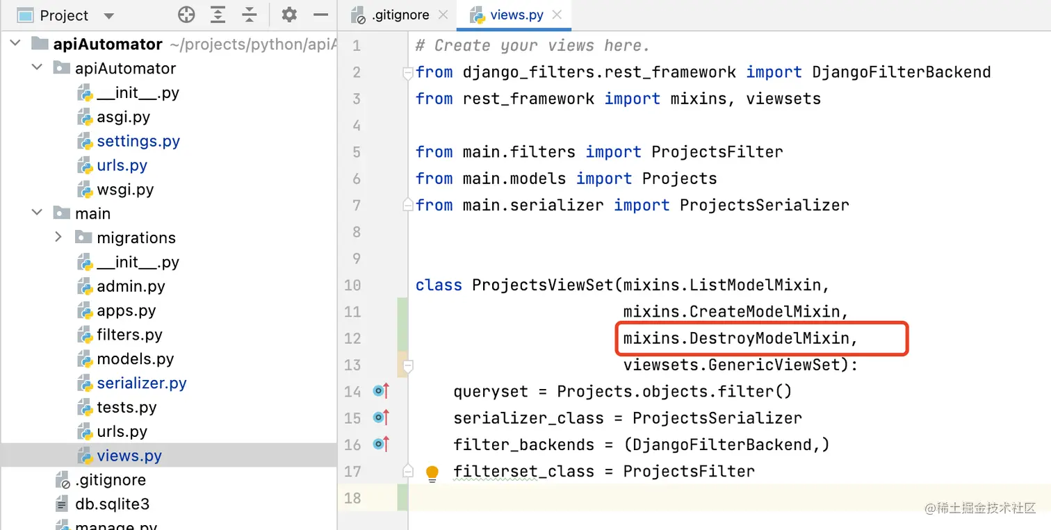 简单的新增接口同样使用DRF的提供的mixins,删除使用DestroyModelMixin。