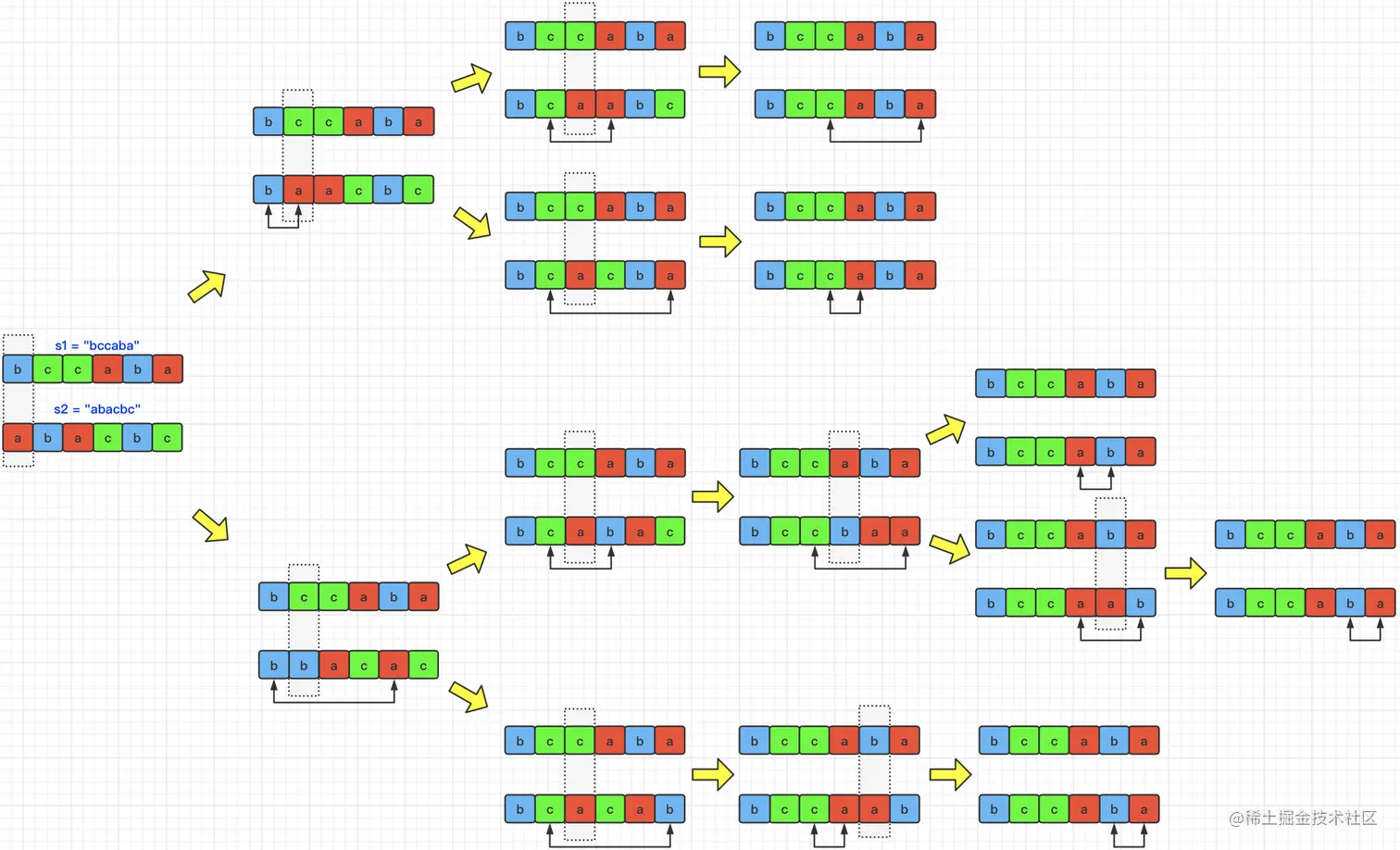 根据题目描述,需要寻找最小相似度,那么这道题我们可以采用回溯算法来进行计算。每次交换都会开辟一条新的“遍历路线”,那么每当我们走完一条路线之后,就需要通过回溯来走其他路线,最终根据计算每条路线的交换次数,返回最小值即可。下面我们以s1=“bccaba”,s2=“abacba”为例,展示一条路线的交换遍历过程,如下图所示: