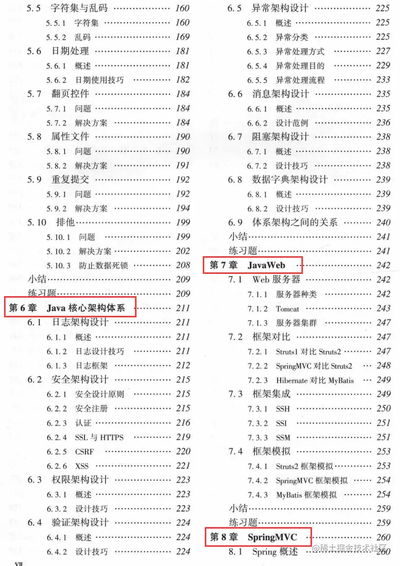 **第6章介绍了Java 八大核心架构体系,**架构师在设计任何系统时,都必须根据系统本身特点对这些体现结构进行合理的设计,否则就不能算是-一个合格的系统。另外,本章以SpringMVC为代表,介绍了部分技术细节的实现,如果能掌握其精髓,其他框架亦会融会贯通。