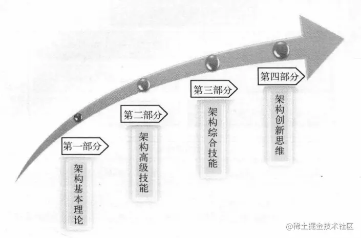 本书共15章,分为架构基本理论、架构高级技能、架构综合技能以及架构创新思维四部分,如下图所示。