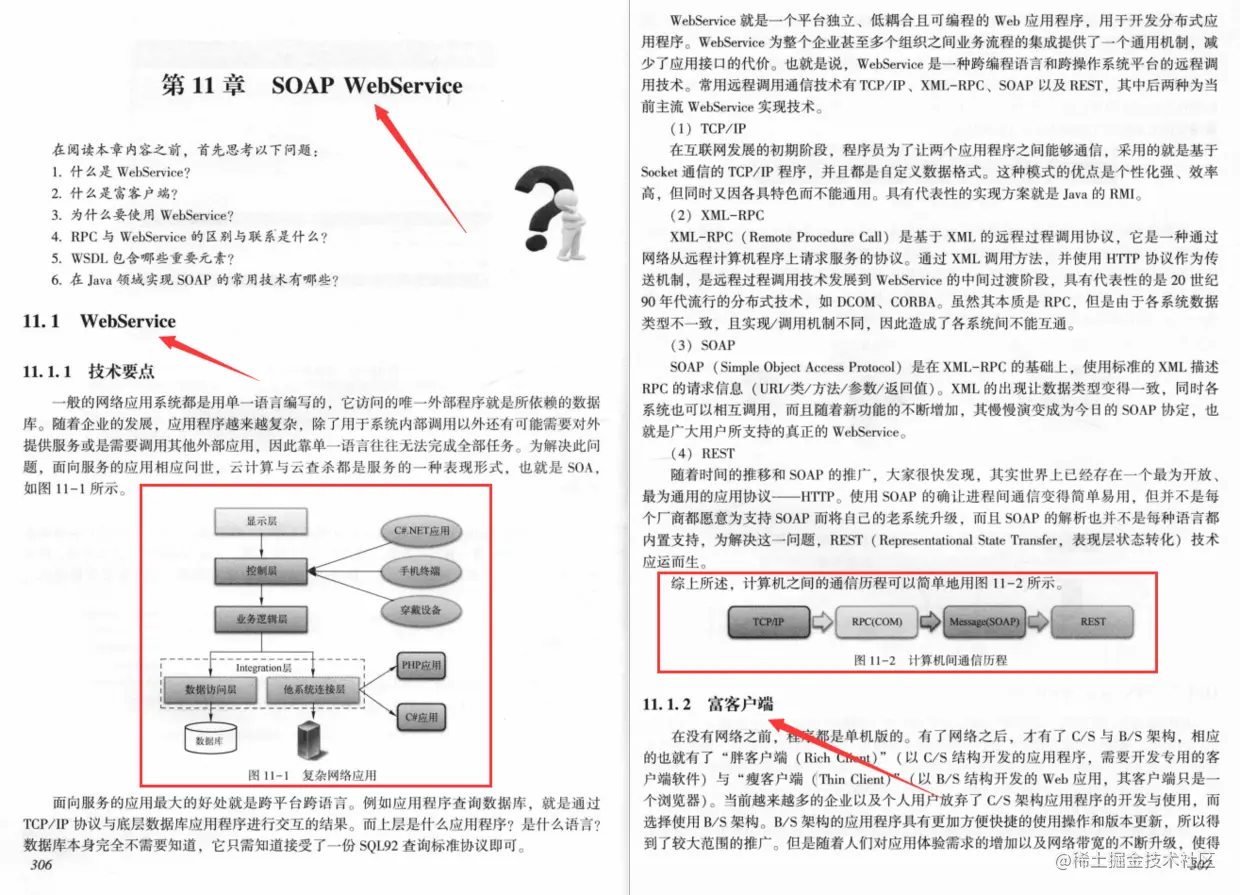 **第11章对SOAPWebService技术进行了系统的介绍,**需要重点掌握SOAP原理以及WSDL各部分组成内容。具体实现案例请参照本章练习题与课后解答。理解好理论之后,可进行实际代码的编写,编写完成之后,再对照理论进行分析总结,这样就会更好地认识与掌握原理与实现的技术细节。