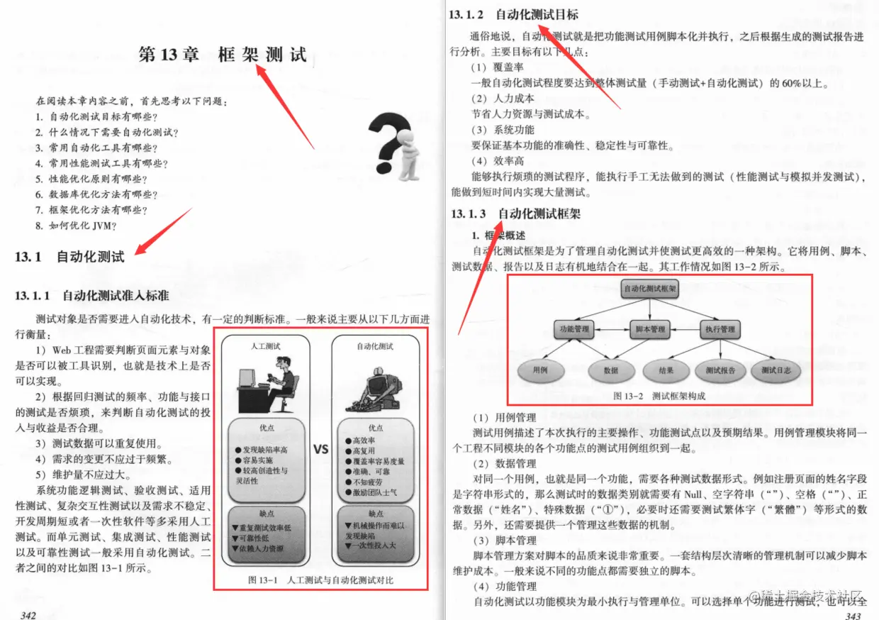 **第13章:**无论是开源框架还是自已公司开发的商业框架都属于产品,而产品是需要不断升级的。为了实现CI/CD,同时也是为了提高测试效率,保障产品品质,设计自动化发布与测试框架势在必行。但是,自动化工具不是万能的,它们各有优缺点,要扬长避短。另外,要注意自动化不能完全取代人工测试。