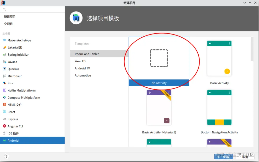 首先我们可以使用Android Studio或者已经装有Android插件的Idea,打开一个新的项目,选择一个没有界面的工程: