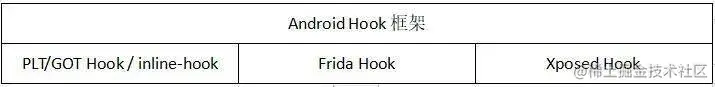 对于Android的Hook框架,主要分为三类,一类是针对Native层,即系统层的Hook框架,使用PLT/GOT Hook或inline-Hook的框架,如bhook、xhook、yahfa等,一类是针对Java层的Hook框架,如Xposed,还有一类是比较特殊的Hook框架——Frida,它是针对全平台Hook而设计的框架,适用于x86\x86_64\arm\arm64架构的系统,在iOS端上的Hook主要通过Frida框架进行技术实现,而Frida在Android上的Hook技术实现也有不少的受众,但主要仍以Xposed类框架为主,主要原因就是Xposed在Andorid上的稳定性更好,并且特征更容易隐藏。