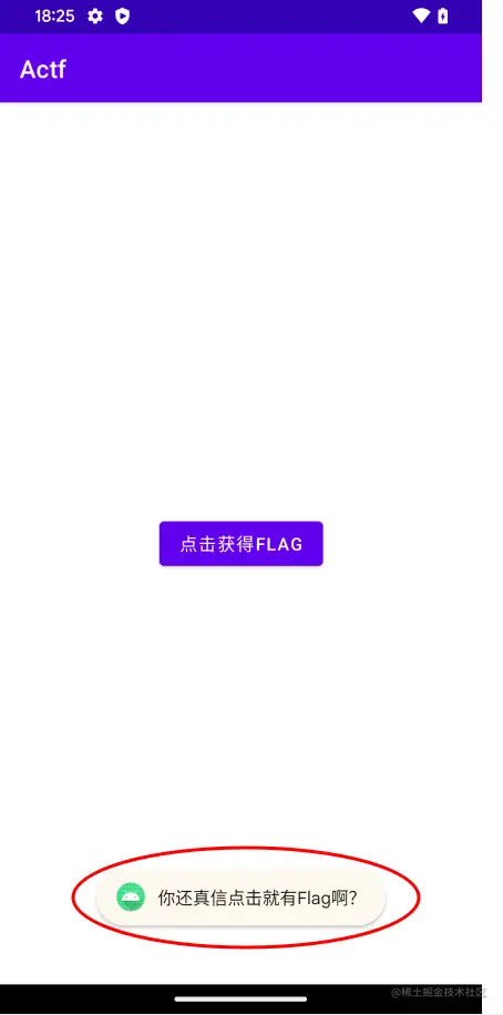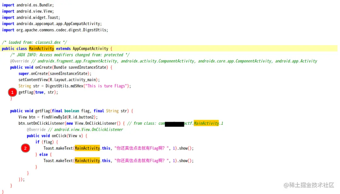 利用jadx-gui可以看到反编译出的源码。如下图所示,通过对该App反编译我们得出了其想要传递Flag 的动作,但要注意的是,这个信息是一个不确定的值,我们需要进一步验证。