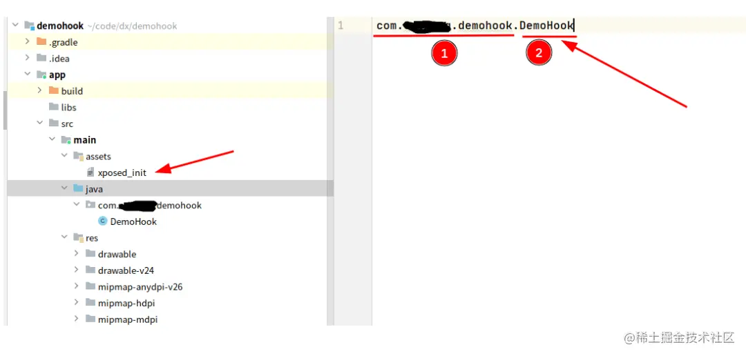 需要注意的是,在写Xposed Hook模块时,为了让Xposed框架识别,需要在项目的assets目录下(如果没有,可以直接新建assets目录)创建一个叫做xposed_init的文件,并且里面的内容为你的包名+你的主类名:
