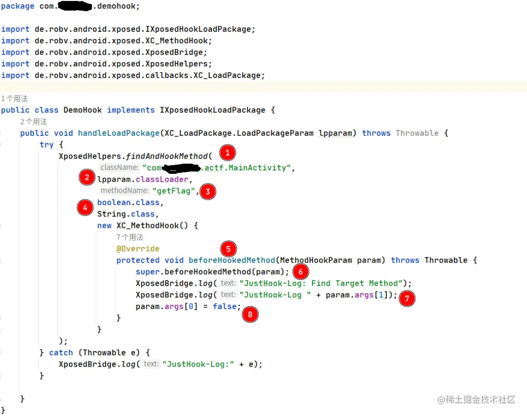 我们的思路就是要先Hook住getFlag这个方法,假设我们Hook住了getFlag这个方法,我们最关心的自然是传入的字符串值,具体的Xposed模块代码如下: