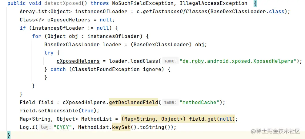 由于Xposed在Hook的时会调用特定的ClassLoader,那么就可以通过再次加载ClassLoader的方式来检测Xposed框架,例子如下: