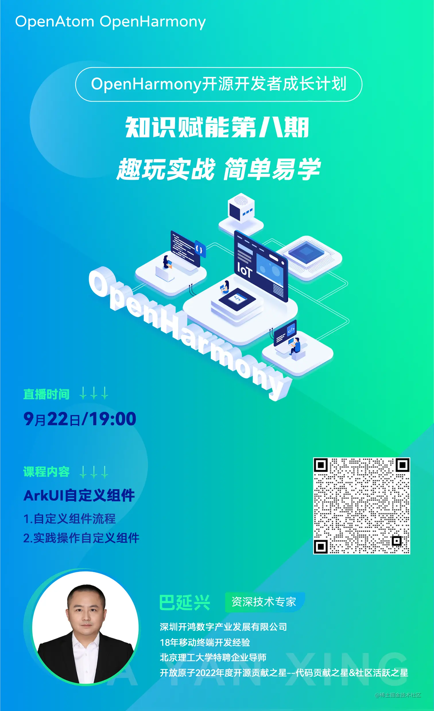而本节直播将继续由巴延兴老师讲解《ArkUI自定义组件》——本次分享将主要介绍两方面内容,包括自定义组件流程和实践操作自定义组件,依旧干货满满!