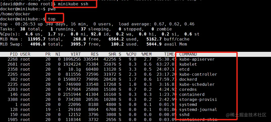 运行miniuke ssh命令进入到Minikube VM。然后使用top命令查看VM中运行的进程,可以看到很多k8s组件: