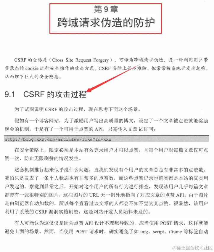 第9章对跨域请求伪造的防护进行了讲解,CSRF的全称是( Cross Site Request Forgery) ,可译为跨域请求伪造,是一种利用用户带登录态的cookie进行安全操作的攻击方式。CSRF实际上并不难防,但常常被系统开发者忽略,从而埋下巨大的安全隐患。