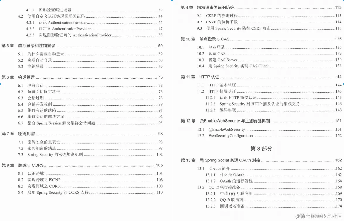 第2部分主要介绍各种定制化的配置场景,剖析Web项目可能遇到的安全问题,并讲解如何使用Spring Security进行有效防护,部分章节还配备了详细的源码导读。