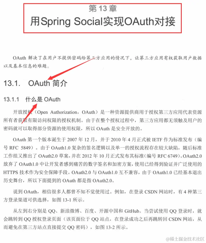 第13章介绍用Spring Social实现OAuth对接,OAuth解决了在用户不提供密码给第三方应用的情况下,让第三方应用有权获取用户数据以及基本信息的难题。