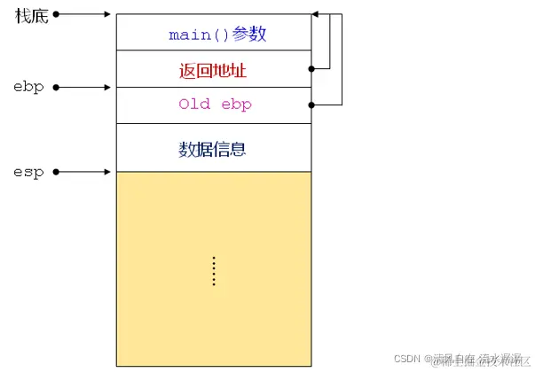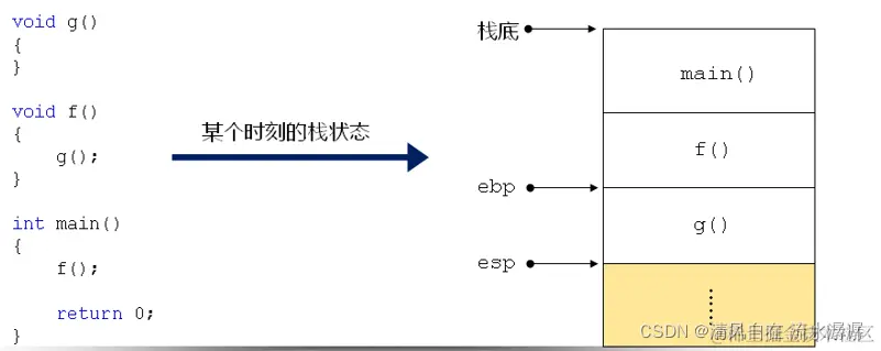 - 栈在程序中用于维护函数调用上下文