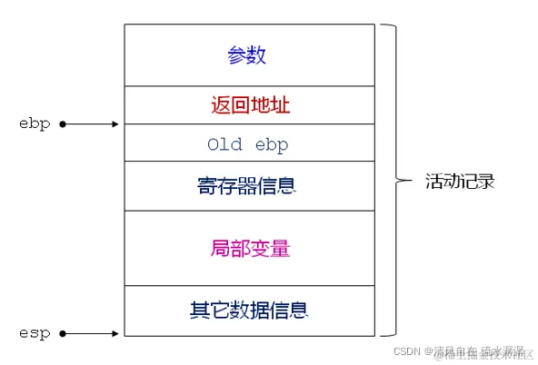 - 调用函数的活动记录位于栈的中部