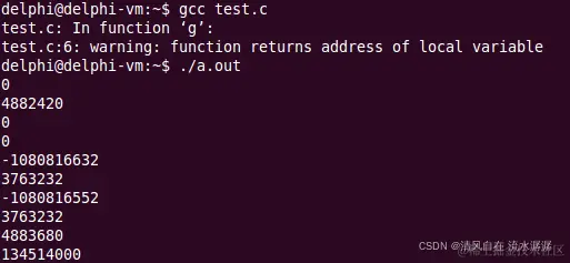 为什么直接打印 pointer[i] 里面的值会是这样呢?因为 pointer 指向的空间是栈空间,栈空间在 g() 函数返回之后,活动记录就被释放了。被释放后调用 printf 函数,printf 函数需要在栈上面建立一个活动记录。这个活动记录就会有 printf 函数的参数信息和返回值等,所以 pointer 所指向的内存里面的数据由于 printf 函数的调用被改变了。因此,不能返回局部变量的地址,不能返回局部数组的数组名。