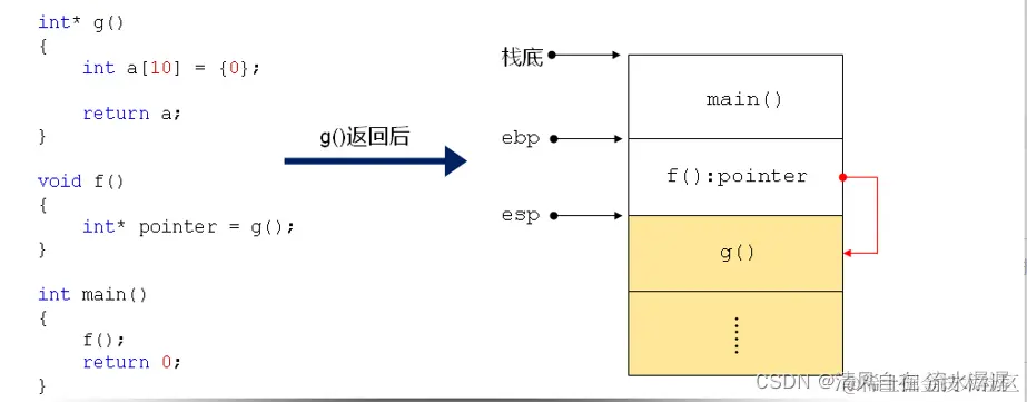 - 函数调用结束后,栈空间将被释放,数据不再有效