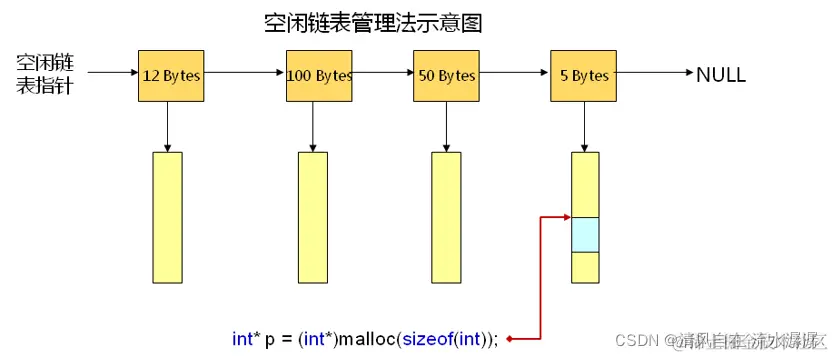以 int* p = (int*)malloc(sizeof(int)); 为例,要申请 4 个字节的大小,遍历之后发现跟 5 Bytes 这个节点最接近,找到一个可以用的单元之后,就将这个单元的地址返还给了 p 指针。以前也提过使用 malloc 申请内存空间时返回的内存空间可能比申请的实际内存空间要大一点点,原因就是在空闲链表管理堆空间这样的系统里面,它会找最近的那个,找到后的一般都大于等于所需要的内存空间,假如 5 Bytes 这个节点下所有的空闲内存单元都用完的话,就会找 12 Bytes 节点下的内存单元,这样malloc 返回的内存空间就有可能比自己实际申请的内存空间要大。