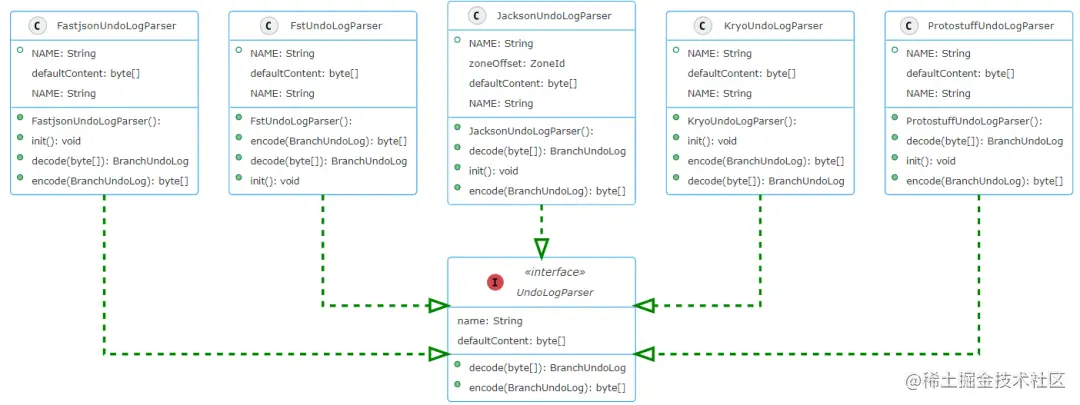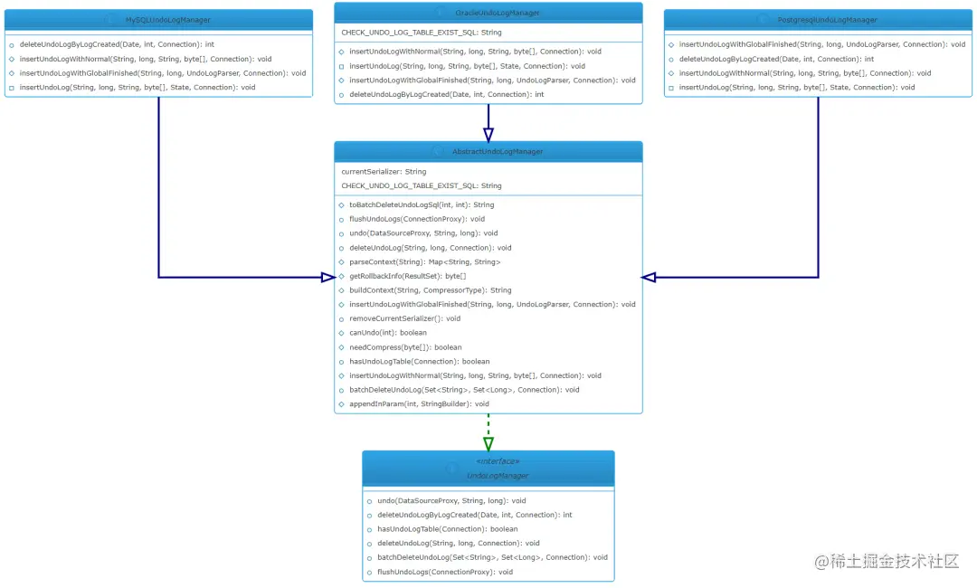 UndoLogManager 负责 undo log 的新加、删除、回滚操作,不同的数据库有不同的实现(不同数据库的 SQL 语法会不同),公共逻辑放在了 AbstractUndoLogManager 抽象类中,整体的类继承关系如下图: