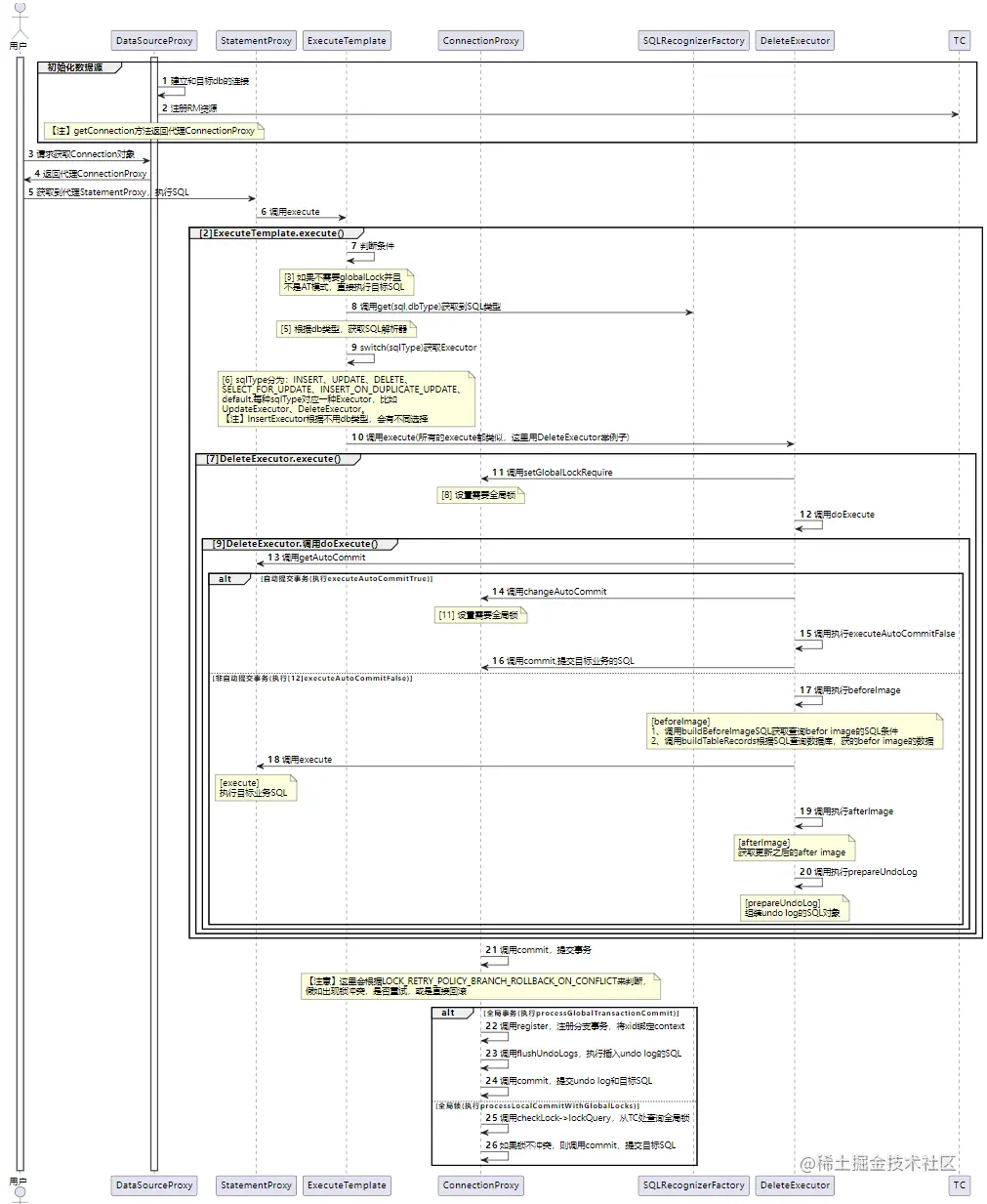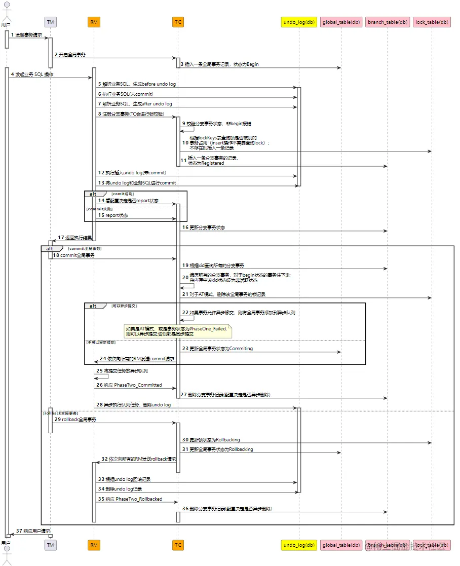 下面的时序图中,展示了 AT 模式在执行过程中,这几个代理类的动作细节: