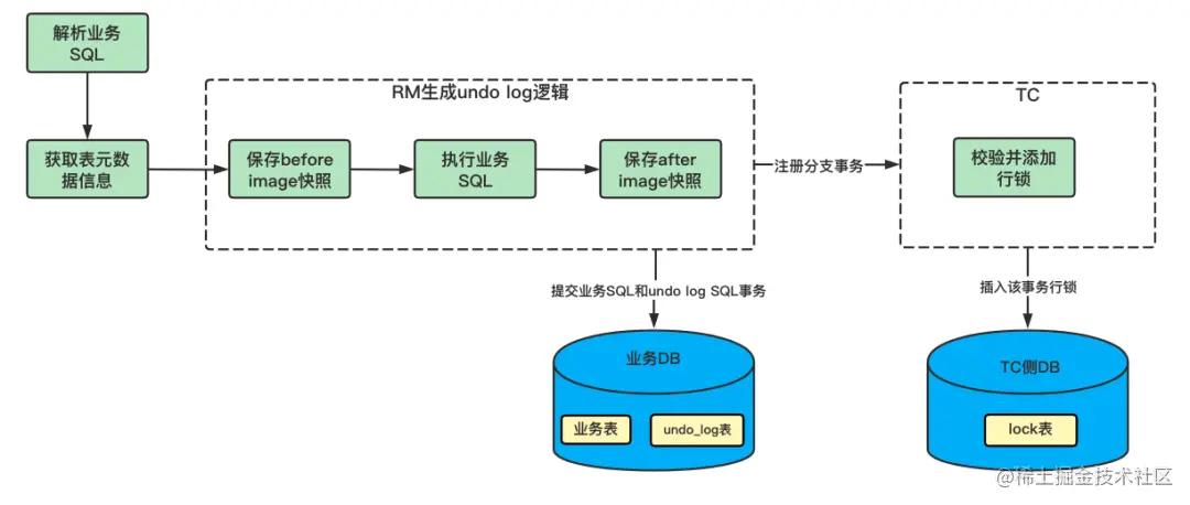 以下是 AT 模式的整体流程,从这里可以看到分布式事务各个关键动作的执行时机,每个动作细节,我们后面来讨论: