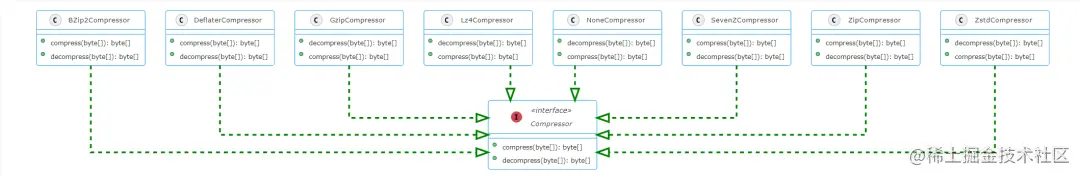 Compressor 接口定义了压缩算法的规范,用来压缩文本,节省存储空间: