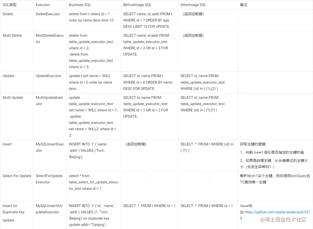 Executor 是 SQL 执行的入口类, AT 在执行 SQL 前后,需要管理 undo log 的 image 记录,主要是构建 undo log ,包括根据不同的业务 SQL ,来组装查询 undo log 的 SQL 语句;执行查询 undo log 的 SQL ,获取到镜像记录数据;执行插入 undo log 的逻辑(未提交事务)。