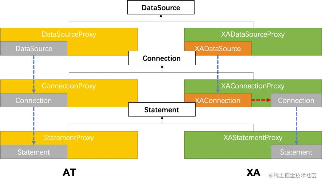AT 的数据源代理中,分别对目标数据库的 DataSource 、 Connection 和 Statement 进行了代理,在执行目标 SQL 动作之前,完成了 RM 资源注册、 undo log 生成、分支事务注册、分支事务提交/回滚等操作,而这些操作对用户并无感知。