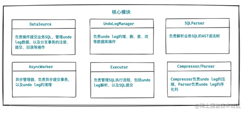 如下是 AT 模式整个流程的主要模块,我们从中可以了解开发 AT 模式需要做哪些事情: