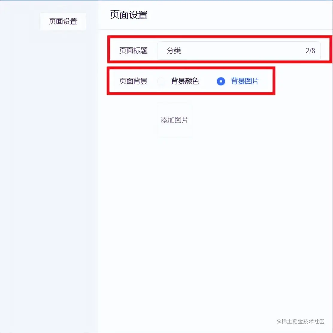 页面设置,可以设置页面的标题和页面的背景,页面背景有两种方式,一种是背景颜色,一种是背景图片,如下图所示: