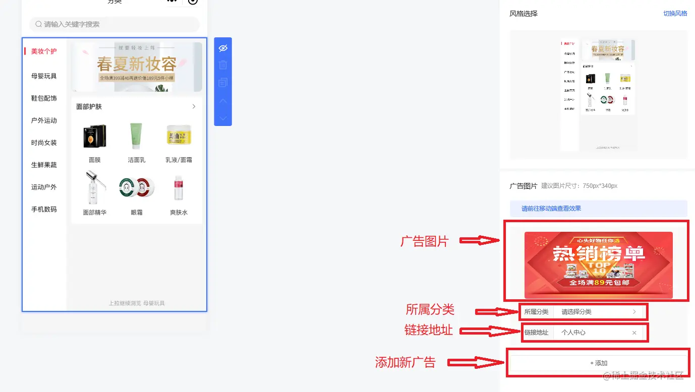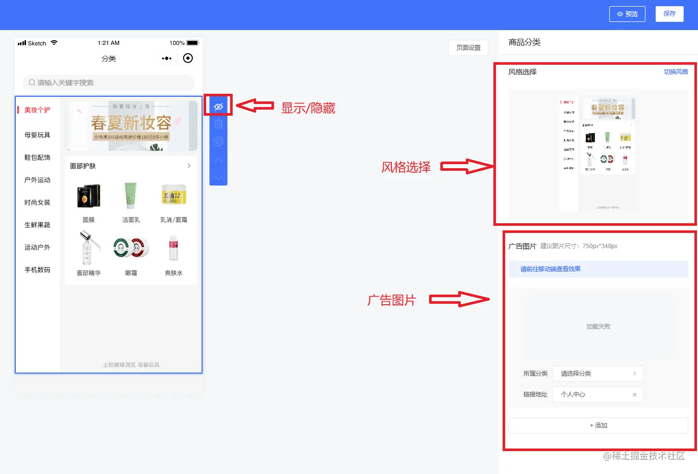 商品分类组件可以显示或者隐藏组件,还可以选择风格类型和插入广告图片,如下图所示: