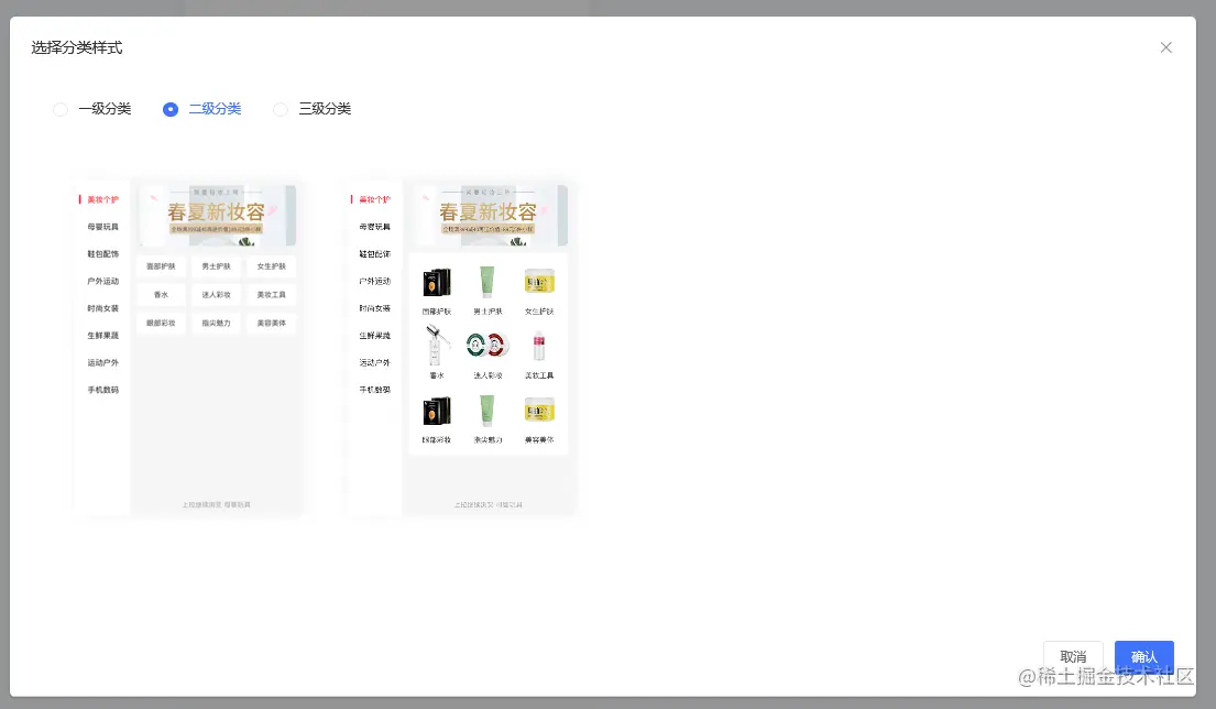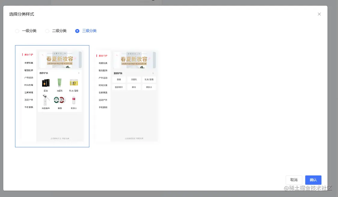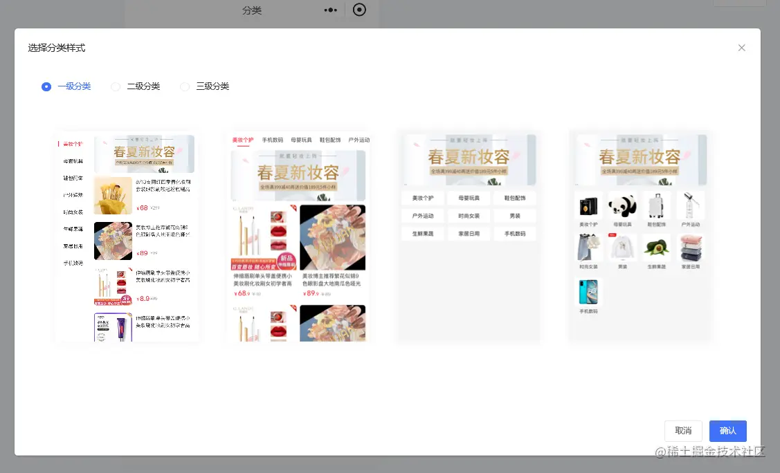 商品分类风格有一级分类、二级分类、三级分类三种分类样式,如下图所示: