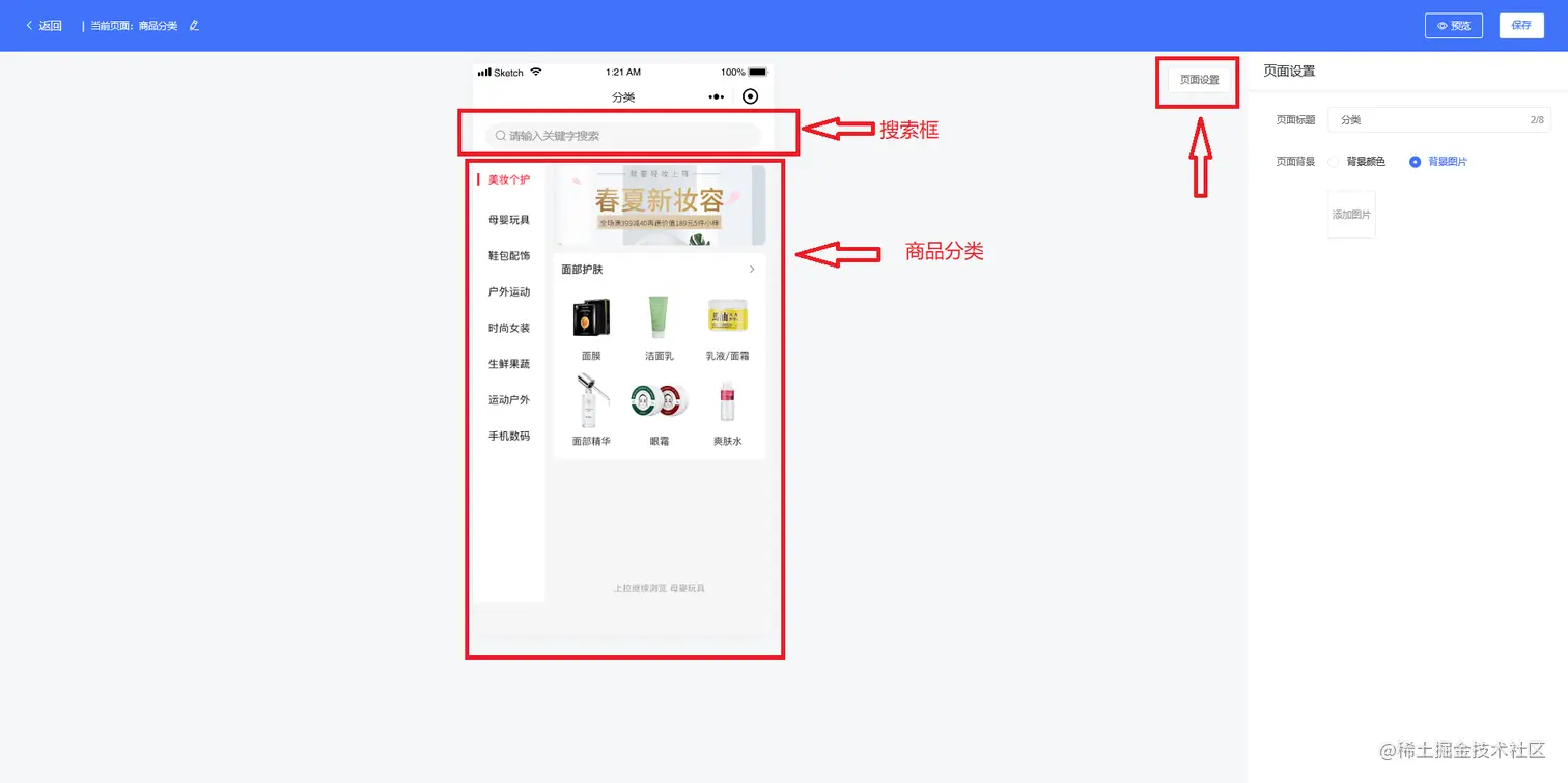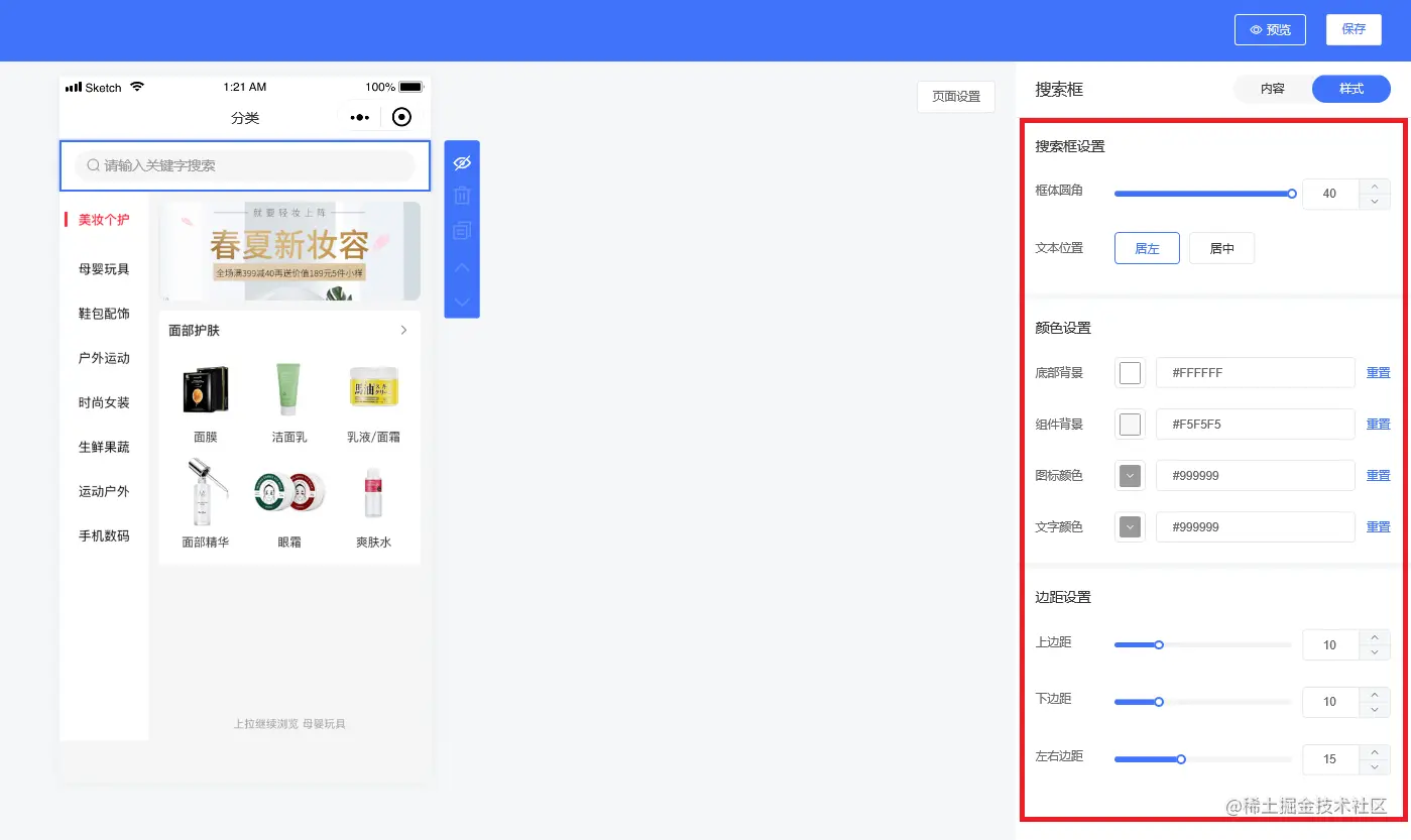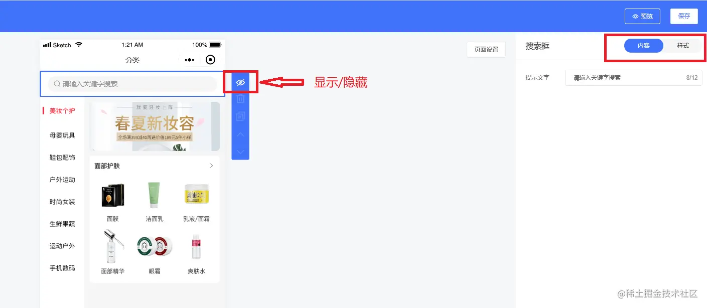 商品分类主要有两个组件,分别是搜索框和商品分类组件,搜索框可以显示或者隐藏,可以设置内容和样式,如下图所示: