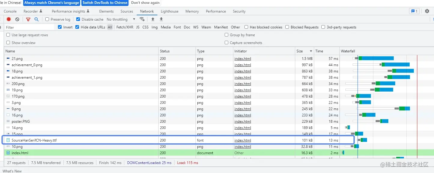 在项目里,设计稿这边使用了"思源"的字体-SourceHanSerifSC-Heavy。于是就把用到的字体Heavy.otf引进项目,但是最后发现字体大小达到了 21.8MB,首次加载时间为6秒,体验不佳,需要对字体包进行优化。