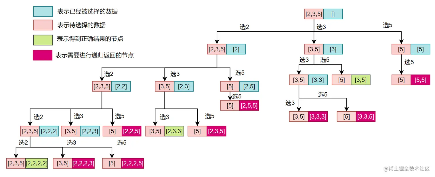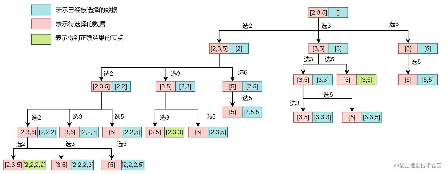 [2, 3, 5]当中进行选择,这就表示了2和其他所有数据[3, 5]进行了组合,因为题目说明我们还可以进行重复选择,因此还加入了2,这就保证了2进行了所有的组合。 - 我们再进行第一次选择的时候。当我们选择3的时候,还能从