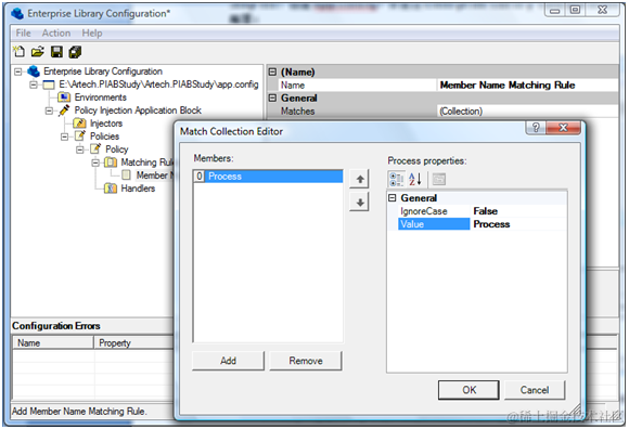 然后 按照相同的方式添加一个Policy Injection Application Block,然后再PIAB节点添加一个Policy。在该Policy下的Match Rules节点下创建一个Method Name Matching Rule (该MatchingRule根据Method name进行CallHandler的匹配),对该MatchingRule进行如下的配置:\