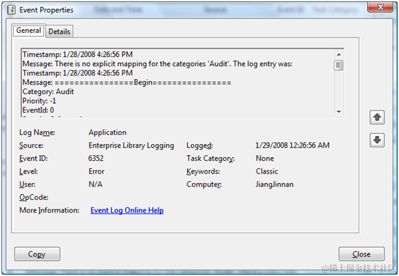 上面我看到了Caching的效果,现在我们在看看Logging。默认情况下,Logging entry被写入Event Log。下图就是我们写入的Log。