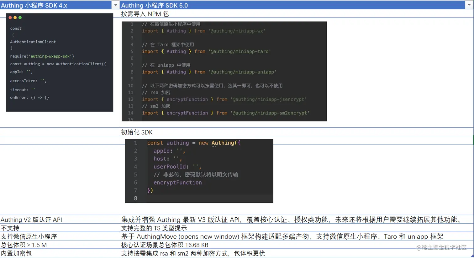 - 支持的接口更多、框架更多,覆盖更多开发者需求: a. 支持的接口更多:集成并增强 Authing 最新 V3 版认证 API,覆盖核心认证、授权类功能 b. 支持的小程序框架更多:支持微信原生小程序、Taro 和 uniapp 框架