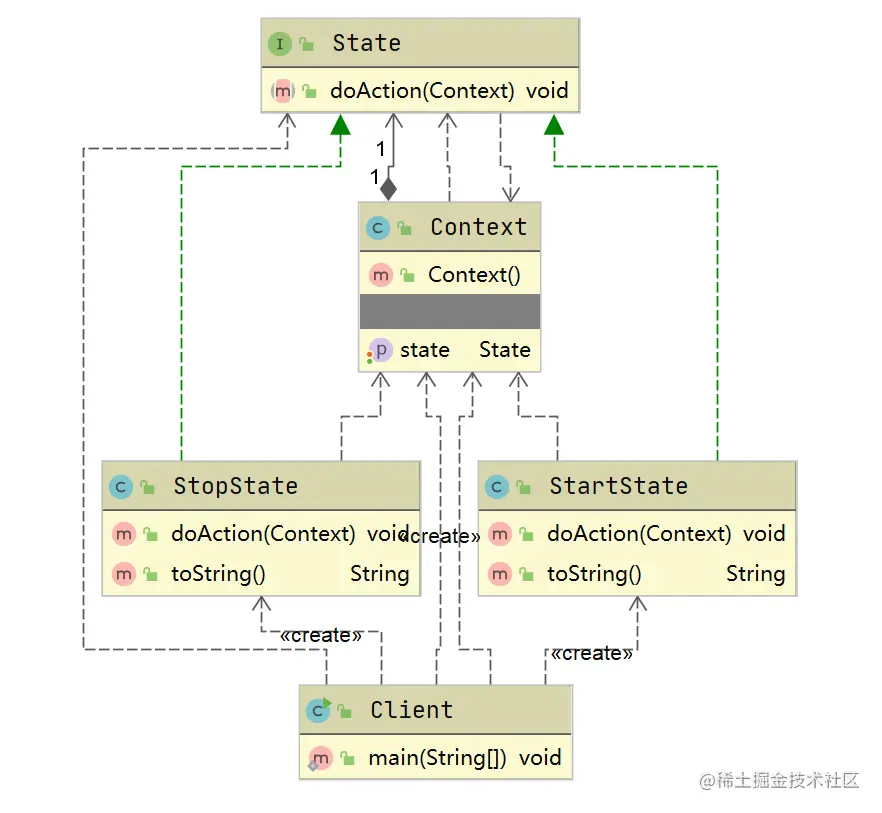 下面以播放器的状态切换为例,状态包括2种:开始、停止。