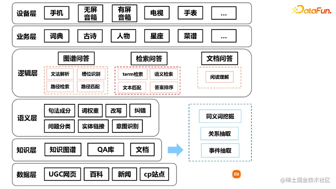 下图是智能问答的框架,主要由数据层、知识层、语义层、逻辑层、业务层、设备层组成。在知识层,本文将分享信息抽取的相关工作。逻辑层主要包括图谱问答、检索问答和文档问答,今天主要分享图谱问答。在业务层,基于问答模块,可以在词典、古诗、人物、星座、菜谱等不同的功能垂域来进行业务层的开发。最后,针对不同的智能硬件,我们在设备层上进行相应的适配,来满足用户在不同终端的需求。