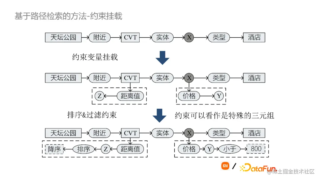约束挂载如上图所示。“离天坛最近的酒店人均800以下酒店是哪一家”,首先通过路径扩展得到上图最上方所示的路径,然后进一步约束CVT节点对应的距离值,同时对酒店实体X的价格约束为小于800。通过上图方式,我们将约束可以看作一种特殊的三元组。比如要求价格小于800块钱,那么“小于”作为谓词,“800”就是作为object值。对于排序约束,将“排序”作为谓词,然后“降序”作为object。将约束信息统一处理成三元组是为了下一步路径匹配的需要。