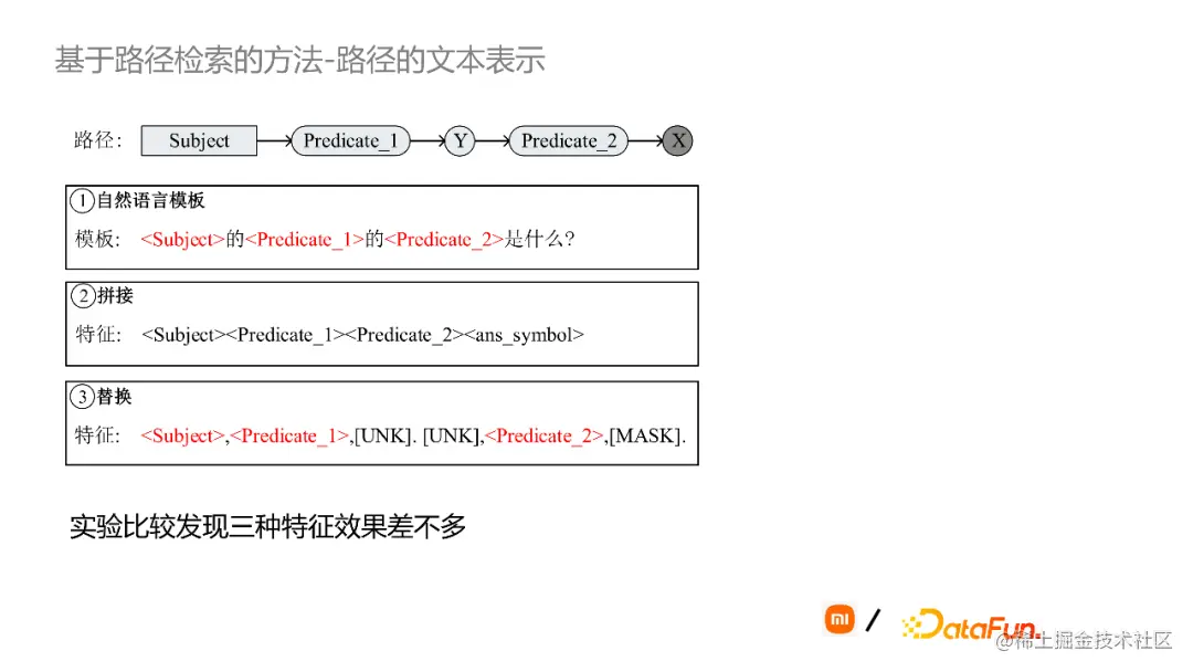 下一步是路径匹配。需要在候选路径中找到最有可能的路径。具体方法为:将路径表达成文本的形式,把它建模成一个语义匹配的任务。路径的文本表示,这里介绍三种方式:第一种方式是设计一个模板将路径表示为一句话;第二种方式是把这个路径中的subject、predicate以及答案节点拼接起来;第三种方式和第二种方式相似,但是把中间节点通过[UNK]字符保留下来。通过实验对比,这三种方式的匹配效果差异不大。选择任意一种方式皆可。