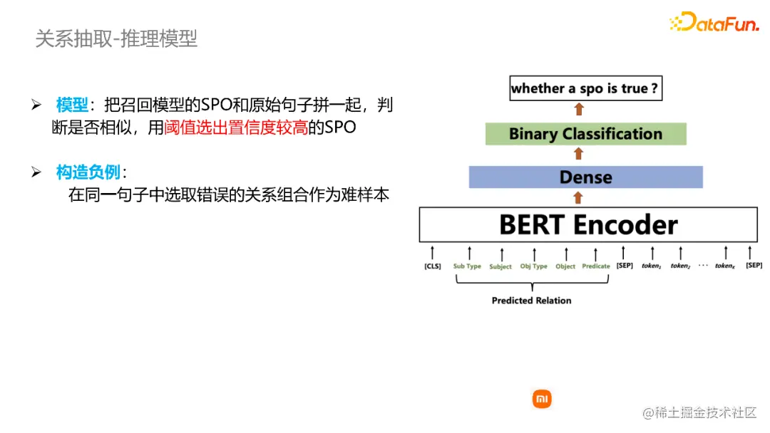 通过SPO模型和PSO模型,得到一些三元组关系的候选队列,还有一个精排的细打分模型。将召回的spo三元组和原始的句子拼接在一起,建模成一个语义相似度的任务,来衡量识别出来的spo三元组和输入文本之间的语义相似度,从而进行细打分。我们可以设定一些阈值,选出置信度较高的一些spo三元组作为最终的抽取结果。