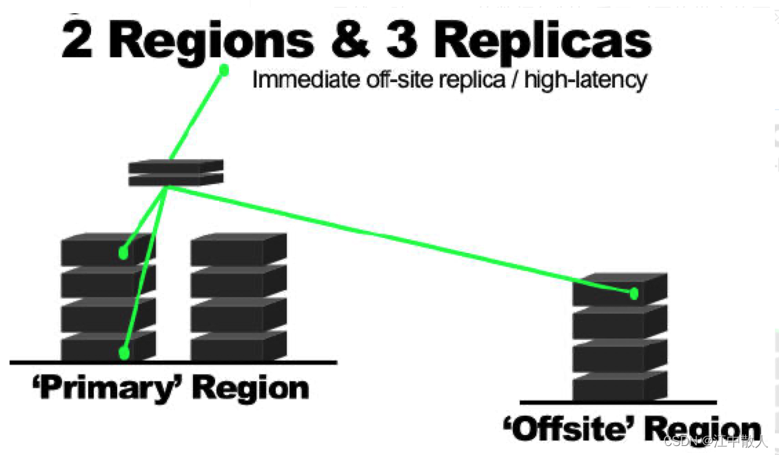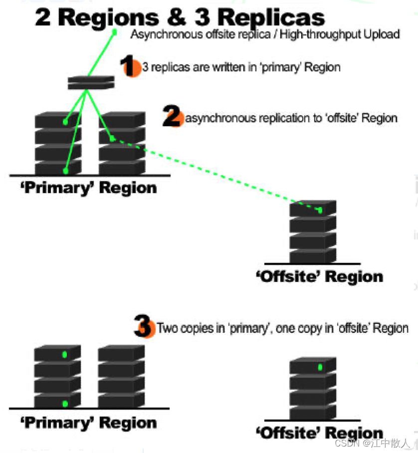 通过将对象存放在不同物理位置上的 Region 内,可以进一步增强数据的可用性。其基本原则是:对于 N 份 replica 和 M 个 region,每个 region 中的 replica 数目为 N/M 的整数,剩余的 replica 在 M 个region 中随机选择。以 N = 3, M = 2 为例,一个 region 中有 1 个 replica,另一个 region 中有两个 replica,如下图所示: