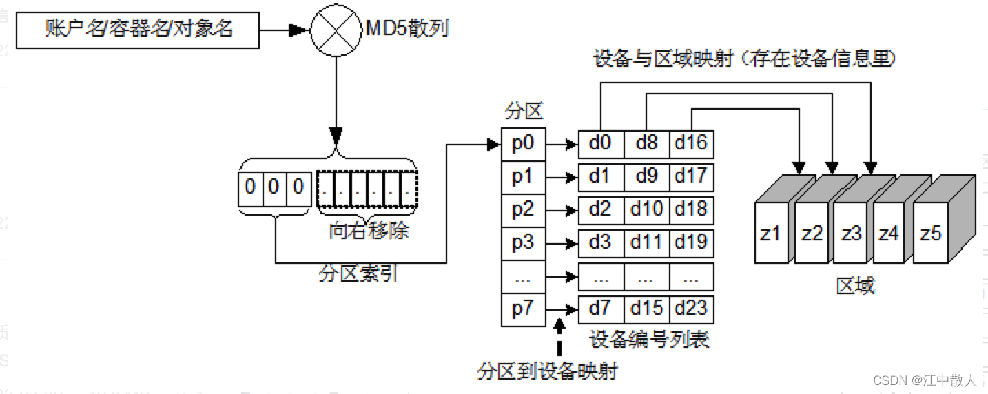 使用对象的层次结构 account/container/object 作为键,使用 MD5 散列算法得到一个散列值,对该散列值的前 4 个字节进行右移操作得到分区索引号,移动位数由上面的 part_shift 设置指定(一致性哈希映射到虚拟节点);按照分区索引号在分区到设备映射表(replica2part2dev_id)里查找该对象所在分区的对应的所有设备编号,这些设备会被尽量选择部署在不同区域(Zone)内,区域只是个抽象概念,它可以是某台机器,某个机架,甚至某个建筑内的机群,以提供最高级别的冗余性,建议至少部署 5 个区域;权重参数是个相对值,可以来根据磁盘的大小来调节,权重越大表示可分配的空间越多,可部署更多的分区。
