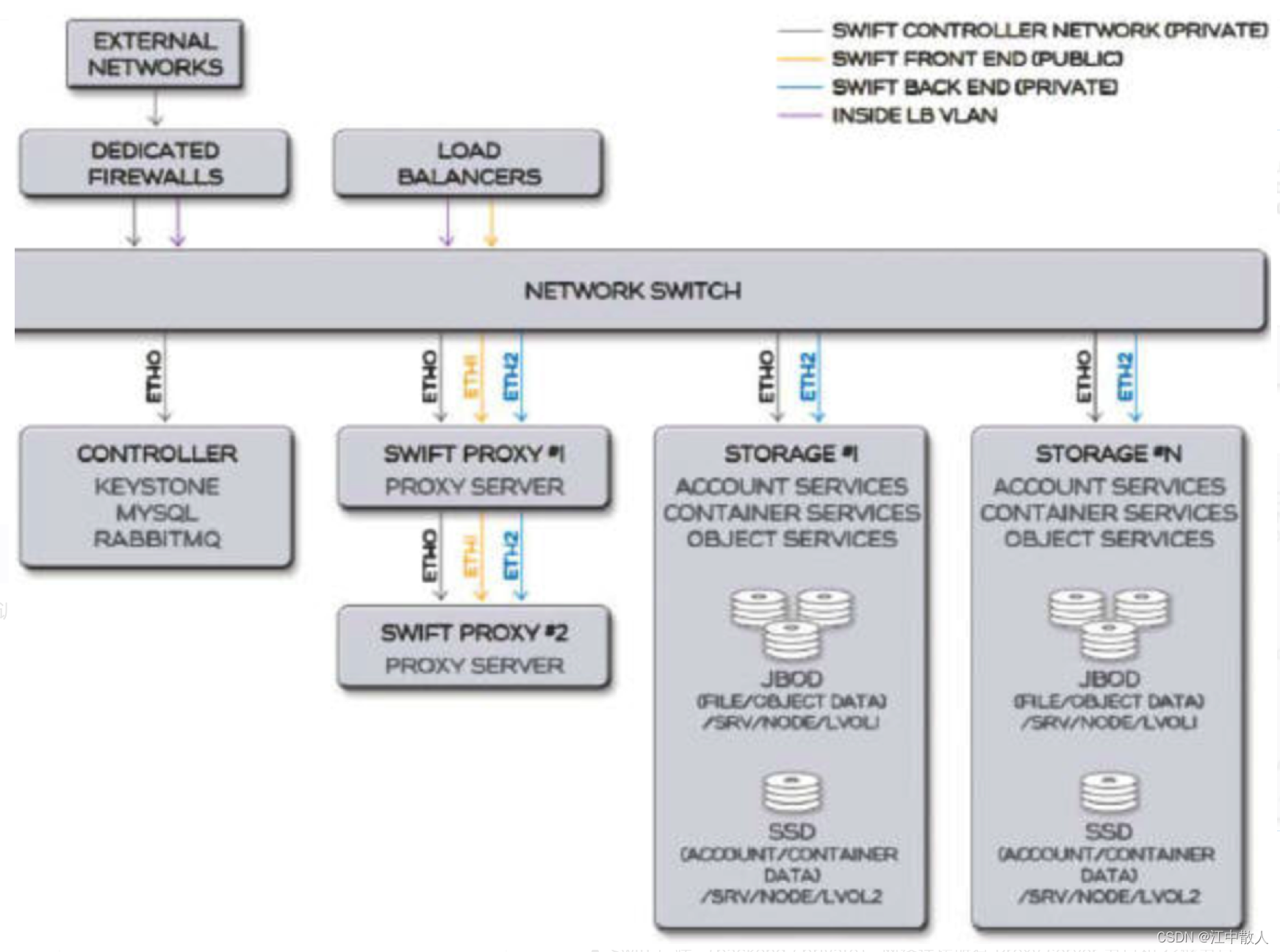 - Swift 前端(front end / public)网络连接 LB 和 所有 Proxy server 节点